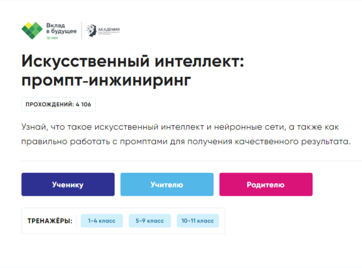 Урок адресован учащимся 1-11 классов, направлен на развитие ключевых компетенций цифровой экономики у школьников, а также их раннюю профориентацию в сфере информационных технологий Цель урока «Искусственный интеллект промпт-инжиниринг» познакомить школьников с внутренним устройством нейросетей и процессом обучения моделей Ученики освоят основные алгоритмы и правила написания промптов, а также попробуют развить навыки на практике с помощью игрового тренажера. Также школьники узнают, как с помощью промптинга взаимодействовать с искусственным интеллектом по решению различных задач в обучении, проектировании, творчестве, в поиске нужной информации и идей.